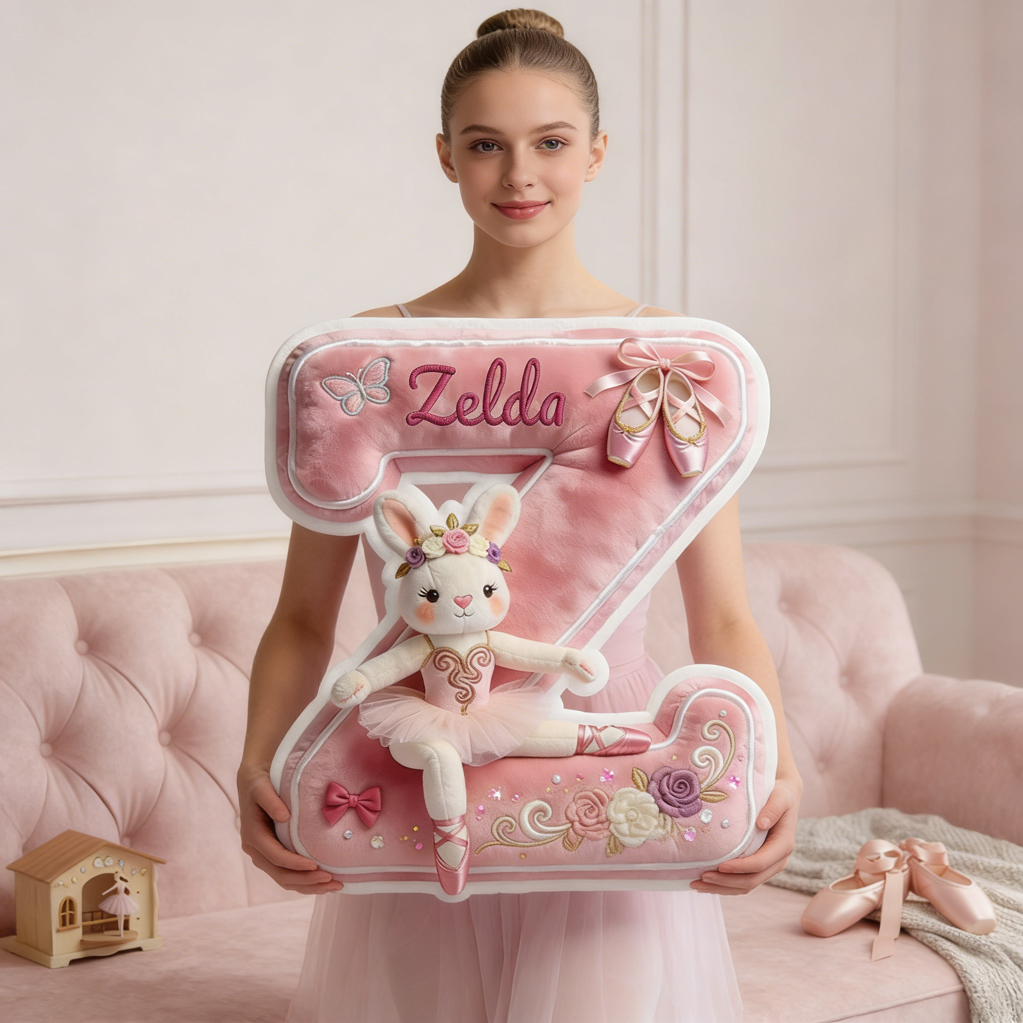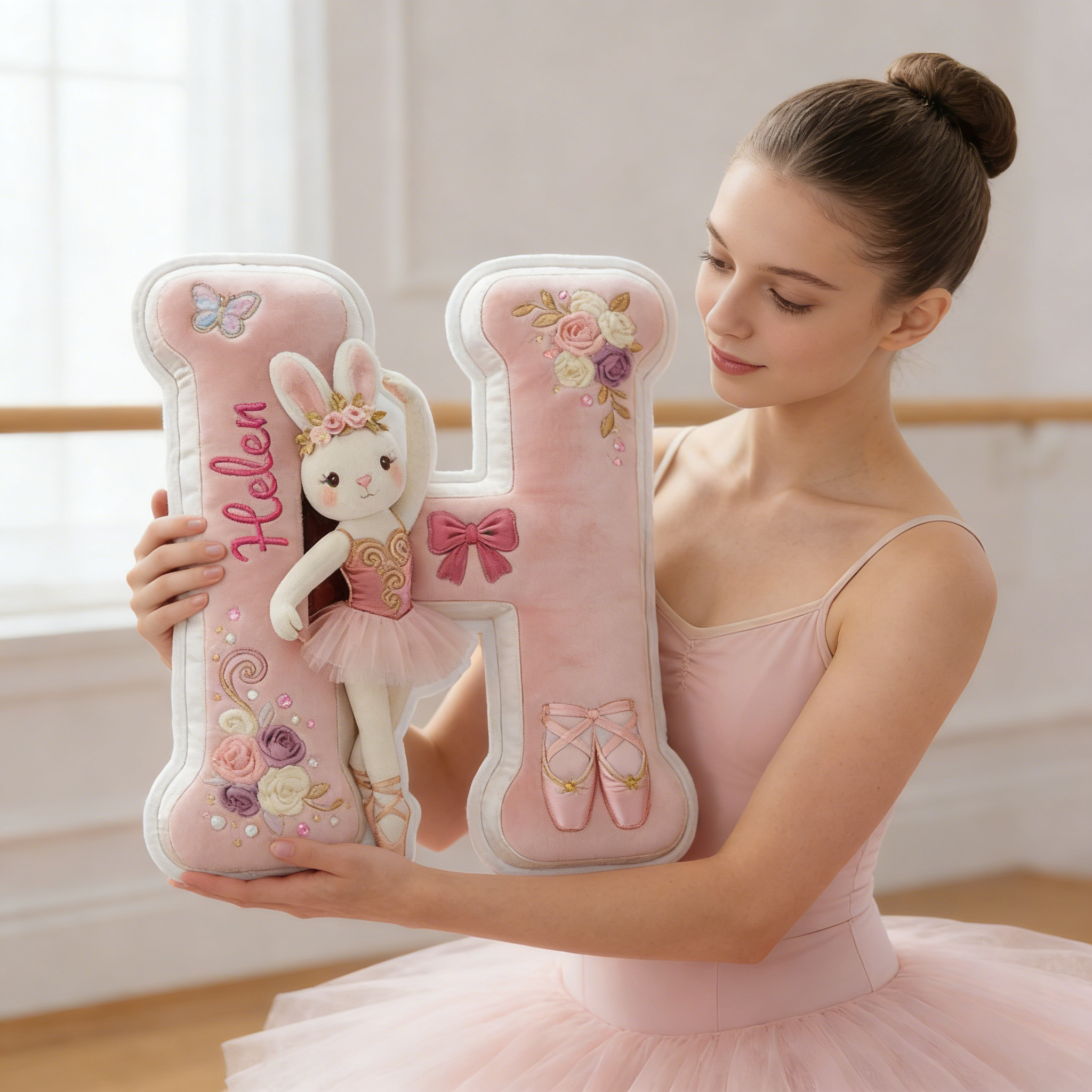 Doté d'une palette rose tendre et d'un charmant lapin de ballet, cet oreiller est conçu pour les filles qui aiment: