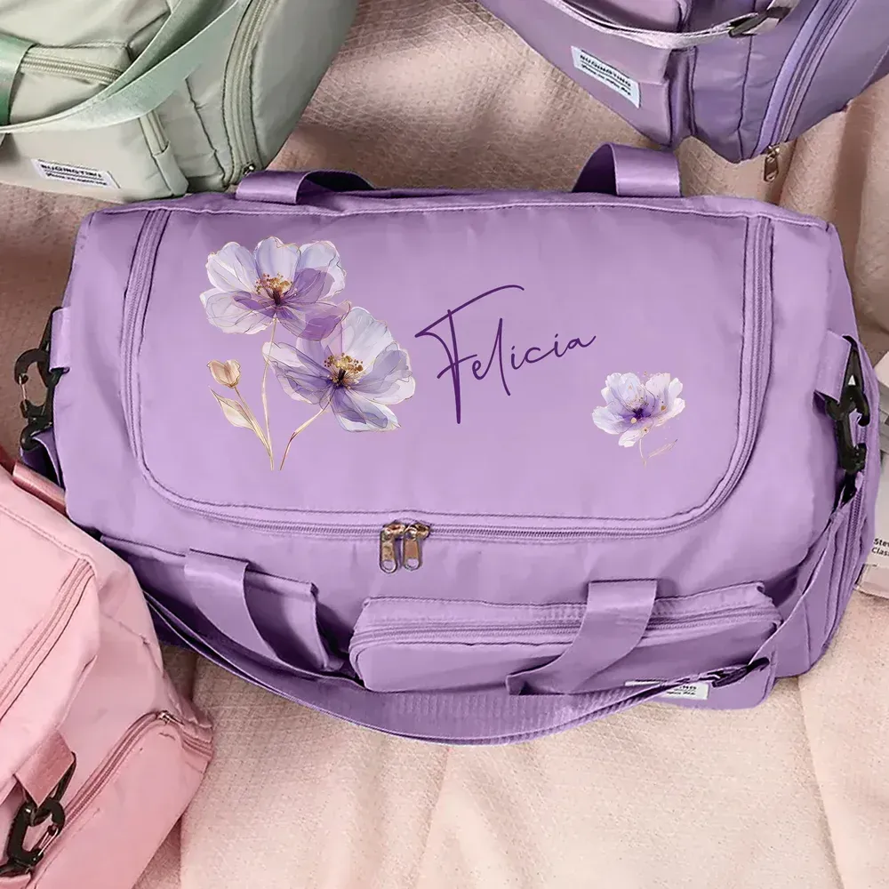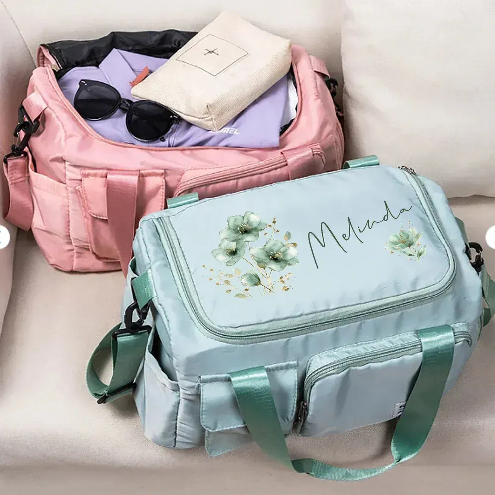 Grand sac de voyage personnalisé de style artistique aquarelle à compartiments multiples avec nom et bandoulière, cadeau d'anniversaire pour femme